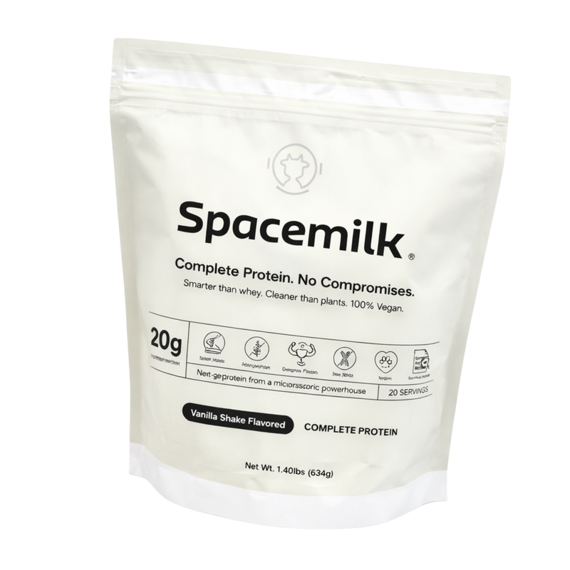 Spacemilk is the world's first yeast protein isolate made from non-GMO baker's yeast (Saccharomyces cerevisiae) through fermentation. It provides 20g of complete protein per serving with a perfect 1.0 PDCAAS (Protein Digestibility Corrected Amino Acid Score).