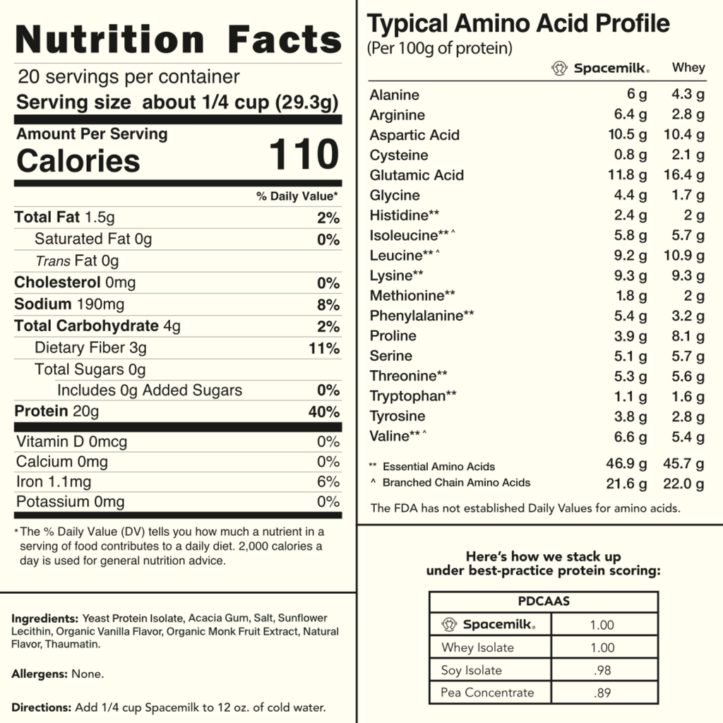 With a perfect 1.0 PDCAAS score, our yeast protein isolate matches the nutritional quality of whey and provides all nine essential amino acids. It’s the complete, clean protein your body needs to build, repair, and thrive.